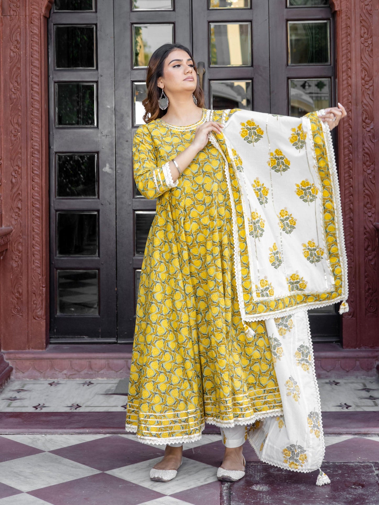 Mustard Cotton Anarkali Kurta Pant Set With Dupatta