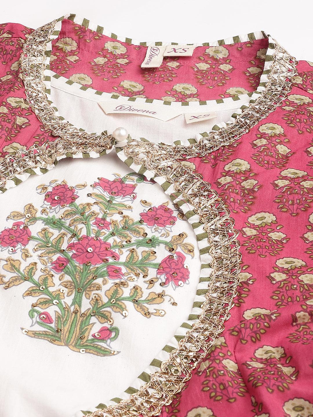 Dark Pink Floral Cotton Anarkali Kurta With Jacket